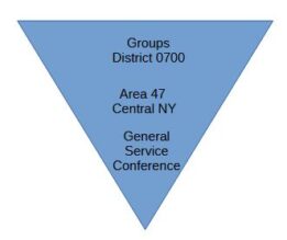 Jefferson County is District 0700 of the Central New York Area 47 of the A.A. General Service Conference. Our service structure is described as the upside down triangle.